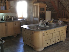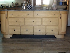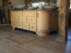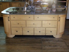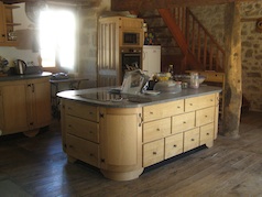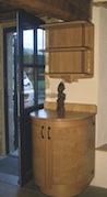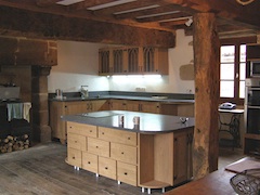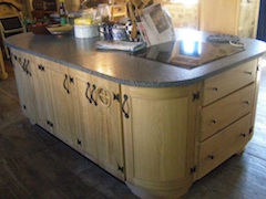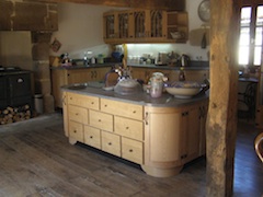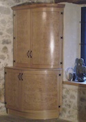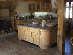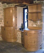 - A solid Oak kitchen with a medieval flavour. Featuring curved doors, inlays, carvings and handmade ironmongery.